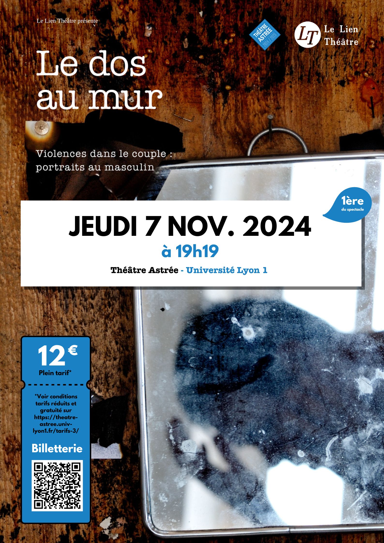 A l’occasion de la dernière semaine de résidence du spectacle, Le dos au mur jouera pour la première fois le jeudi 7 novembre 2024 à 19h19 au Théâtre Astrée – Université Lyon 1 à Villeurbanne.