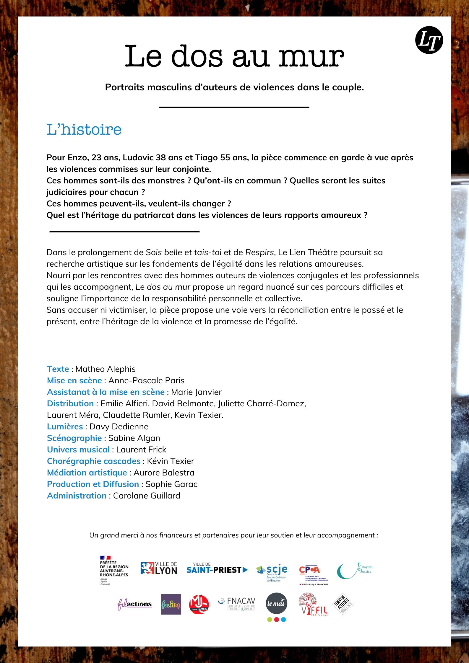 Un grand merci à nos partenaires pour leur soutien sur ce projet : La Délégation aux droits des femmes et à l’égalité entre les femmes et les hommes du Rhône, la Ville de Lyon, la Ville de Saint-Priest, le Service de Contrôle Judiciaire et d’Enquête (SCJE), le Centre de Prise en Charge des Auteurs de Violences Conjugales (CPCA), Citoyens et Justice, Filactions, Feeling, la MJC Jean Cocteau, le Théâtre Astrée, la FNACAV – lutte contre les violences familiales et conjugales, Viffil – SOS femmes.