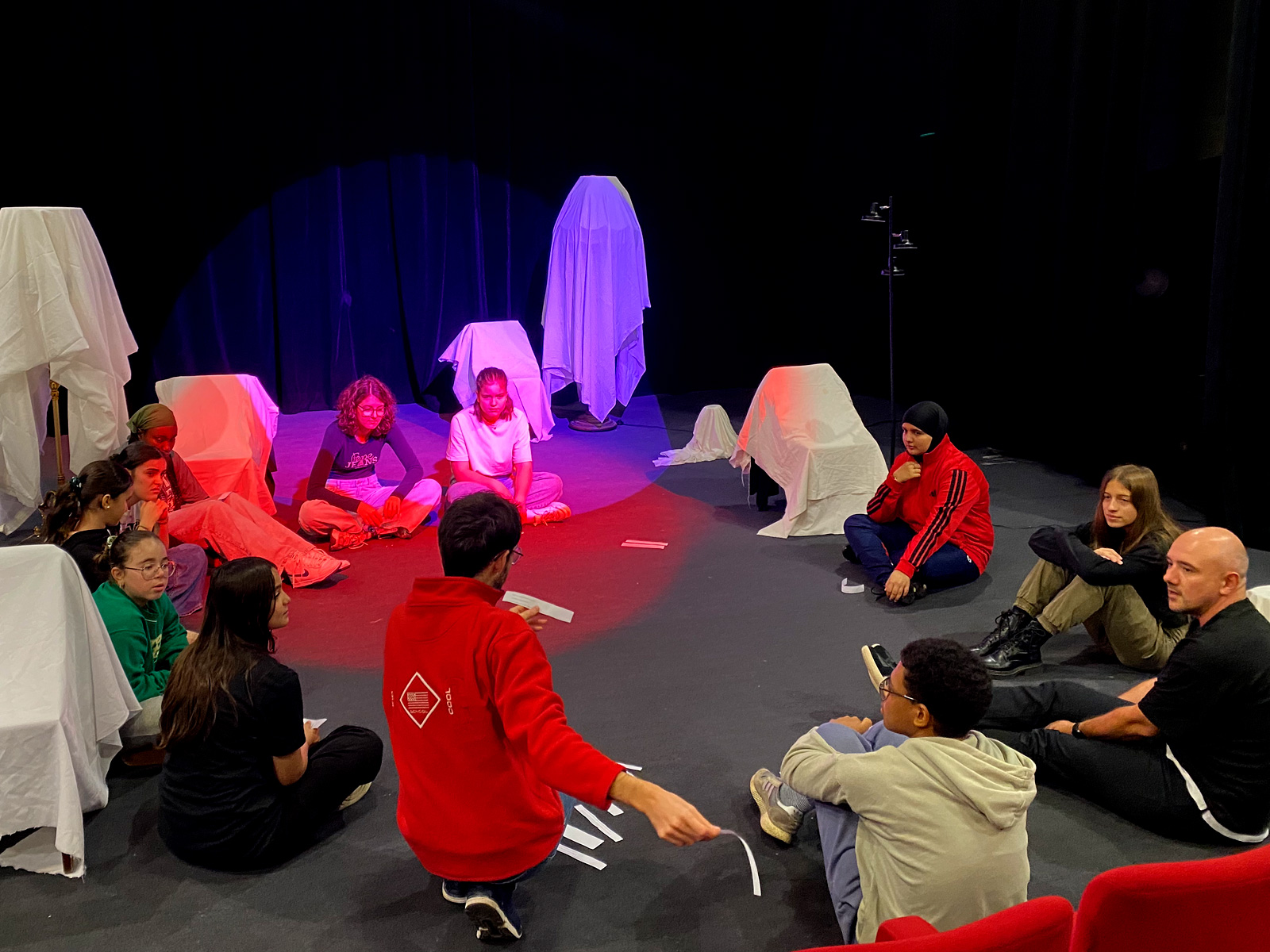 A Saint-Priest nous avons rencontré des jeunes de 11 à 18 ans, des habitant.es des différents quartiers de la ville et un groupe de femmes du Centre social l’Olivier. Nous avons présenté des scènes d’accroche pour initier des échanges et des réflexions autour de la notion de la place : dans la société, dans la famille, dans les relations amoureuses, dans son propre corps, dans un groupe, dans des violences systémiques, dans le regard des autres. Ensemble, nous avons interrogé la place en tant que lien à soi, en tant que lien à l’autre : Qui suis-je ? Et par rapport à qui ? A quoi ?